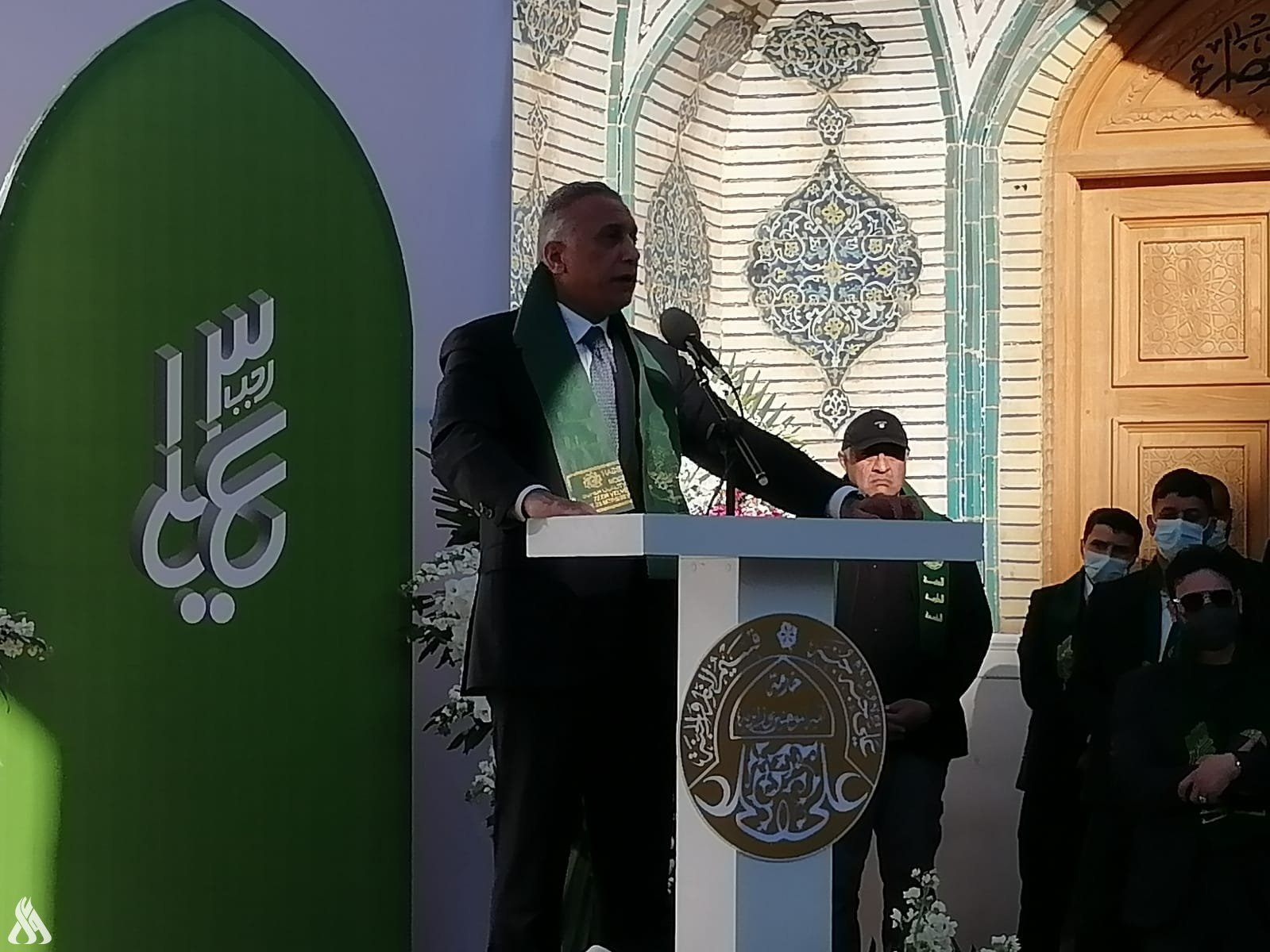 وقال الكاظمي في كلمته في احتفالية رفع الستار عن المنارة الثانية لمرقد الإمام علي بن أبي طالب (عليه السلام)، بمناسبة ذكرى ولادته المباركة، إن العراق يمر بظروف معقدة وهناك من حاول خلق فتنة طائفية".