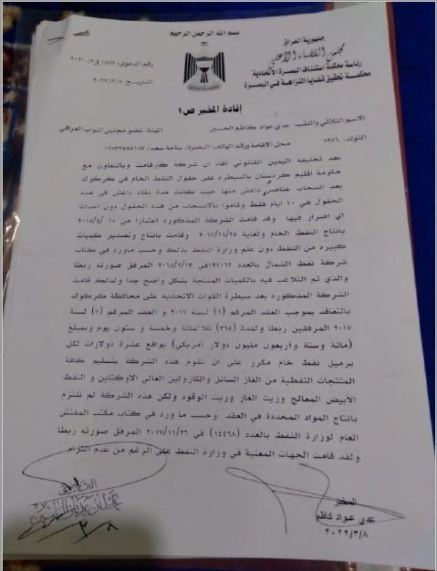 كشفت وثائق نشرت، اليوم الأحد، عن قيام مالك شركة كار للطاقة “شيخ باز” بسرقة نفط محافظة كركوك ابان سيطرة تنظيم “داعش” الاجرامي على أجزاء واسعة من المحافظة في 2014 دون علم وزارة النفط.
