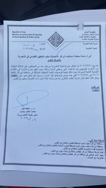 واضاف البيان انه “اظهرت وثيقة صادرة عن مديرية بلدية الناصرية ان المهندس محمد عكاب، رفع دعوى قضائية الى محكمة استئناف ذي قار الاتحادية ، لغرض اتخاذ الاجراءات القانونية بحق مجموعة من الموظفين على الملاك المؤقت يعملون بصفة اجر يومي في المديرية ،حاولت اغلاق مقر البلدية وابتزاز الموظفين، وذلك بسبب نقلهم خارج الدائرة الى الاقسام والشعب التابعة للمديرية “.