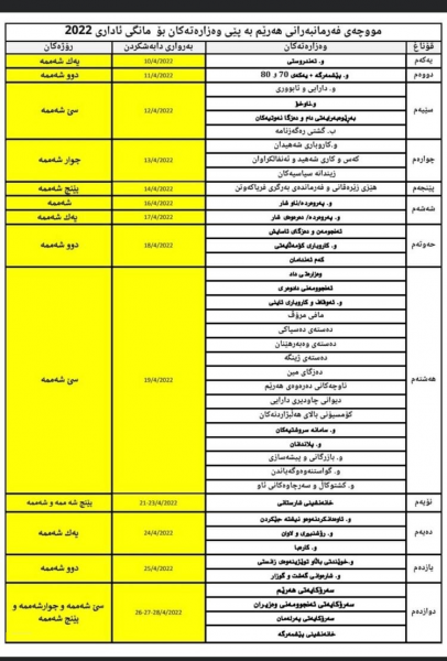 وبحسب الجدول ادناه فان توزيع رواتب شهر آذار الماضي سيبدا اعتباراً من نيسان الحالي.