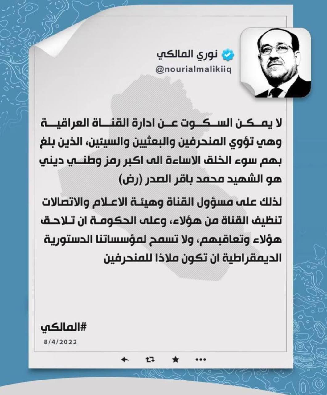 المالكي مغردا ….لايمكن السكوت عن ادارة القناة العراقية وهي تؤوي المنحرفين والبعثيين والسيئين ..