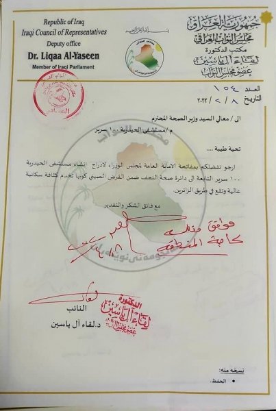 النائب الدكتورة "لقاء آل ياسين" تستحصل موافقة السيد معالي وزير الصحة الدكتور "هاني العقابي" المحترم لغرض انشاء مايلي: