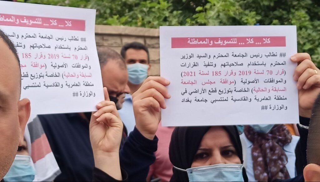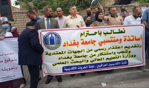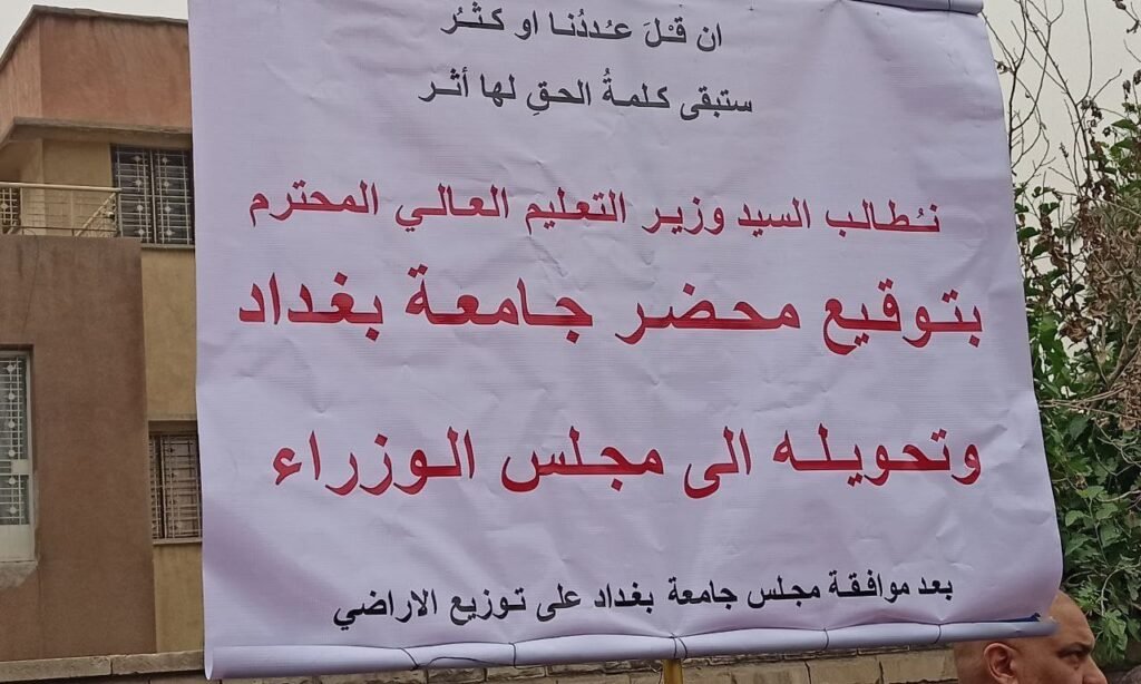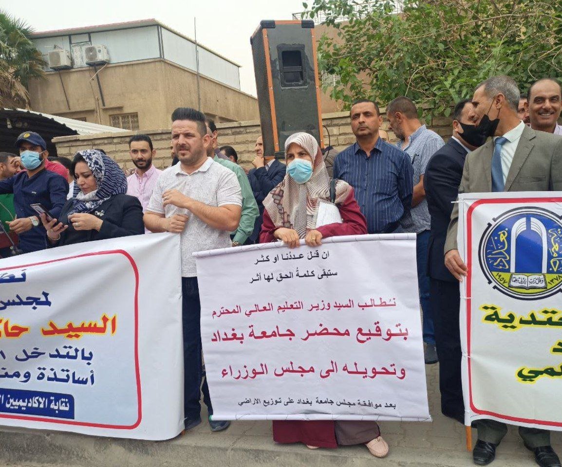 تظاهر العشرات من أساتذة جامعة بغداد، اليوم الأحد، أمام وزارة التعليم العالي والبحث العلمي، للمطالبة بقطع الأراضي.