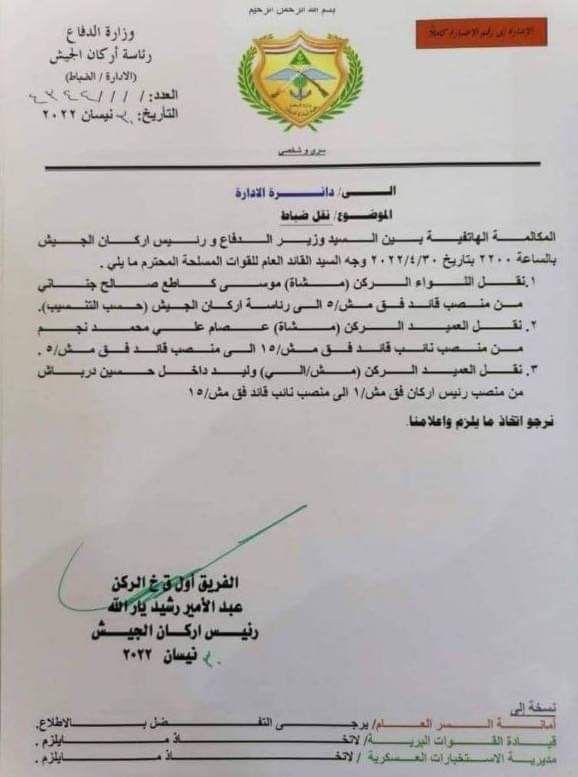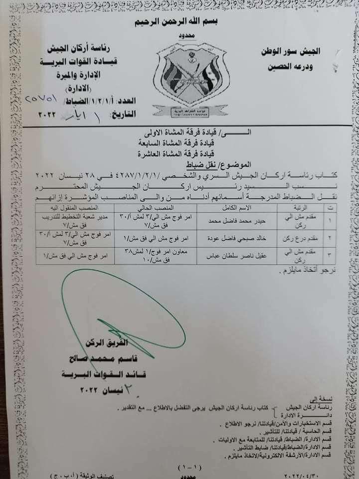 وبحسب الوثائق فإن التغييرات طالت ضباطا من مراتب وصنوف مختلفة بينها المشاة والاستخبارات وعلى مستويات رفيعة شملت أمراء أفواج وقادة فرق.