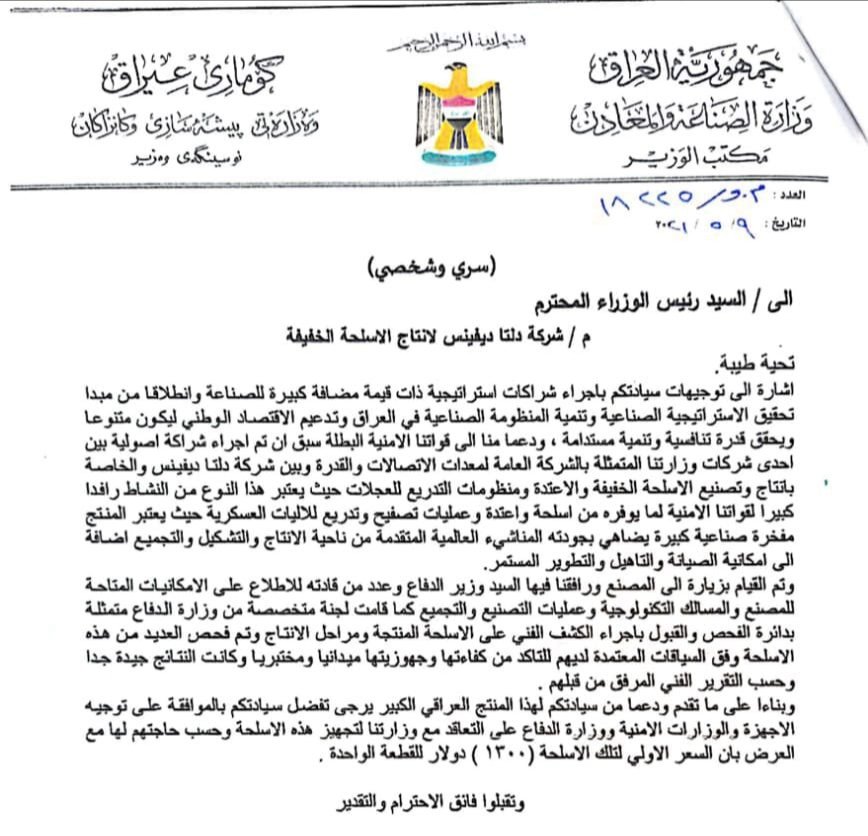 وقال الجبوري في تغريدة على تويتر معززة بالوثائق تابعتها" وكالة تنوع نيوز" اليوم الأحد، إن "وزير الصناعة منهل الخباز يروج لشركة دلتا ديفينس وهي شركة وسيطة لبيع الاسلحة الخفيفة ويطلب من الكاظمي التعاقد معها لتجهيز الجيش والقوات الامنية باسلحتها".