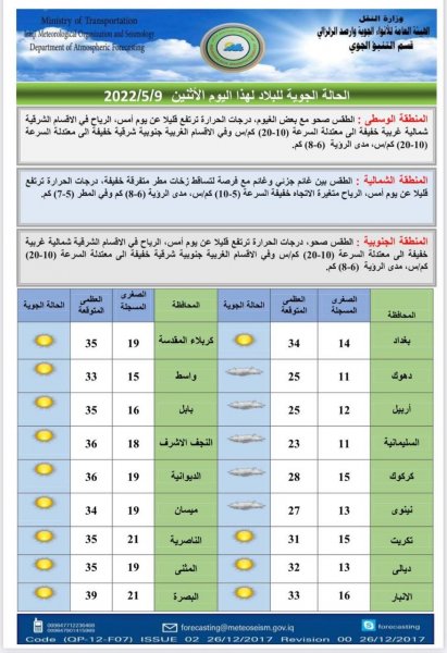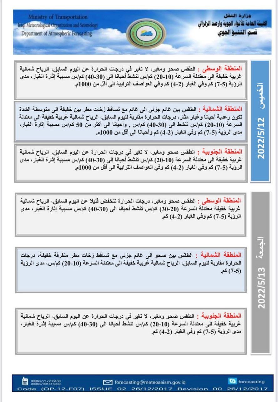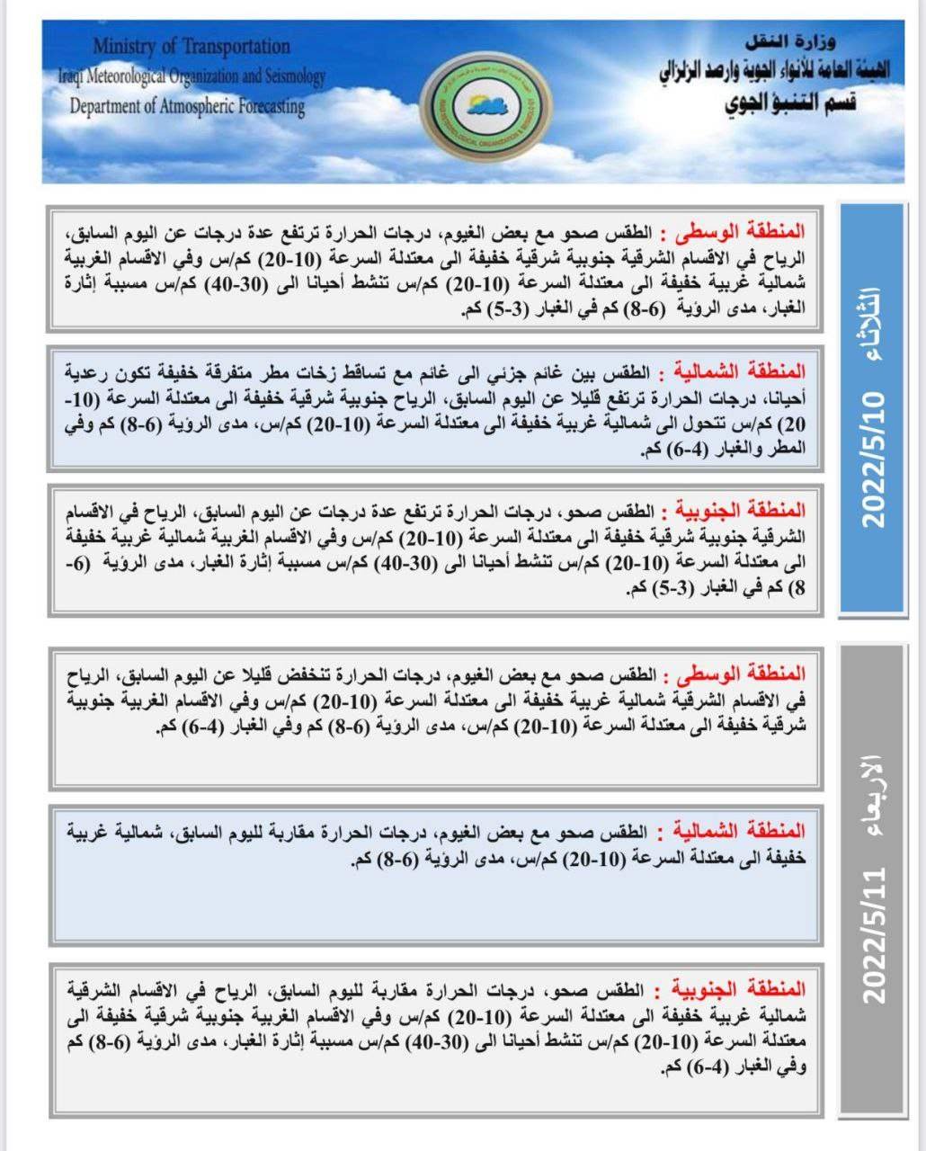 نشرت هيئة الأنواء الجوية والرصد الزلزالي، اليوم الاثنين، توقعاتها لحالة الطقس في عموم مناطق العراق، مشيرةً إلى أن طقس اليوم سيكون صحواً، بينما طقس الأيام الأربعة المقبلة، سيشهد تصاعداً للغبار في المنطقتين الوسطى والجنوبية.