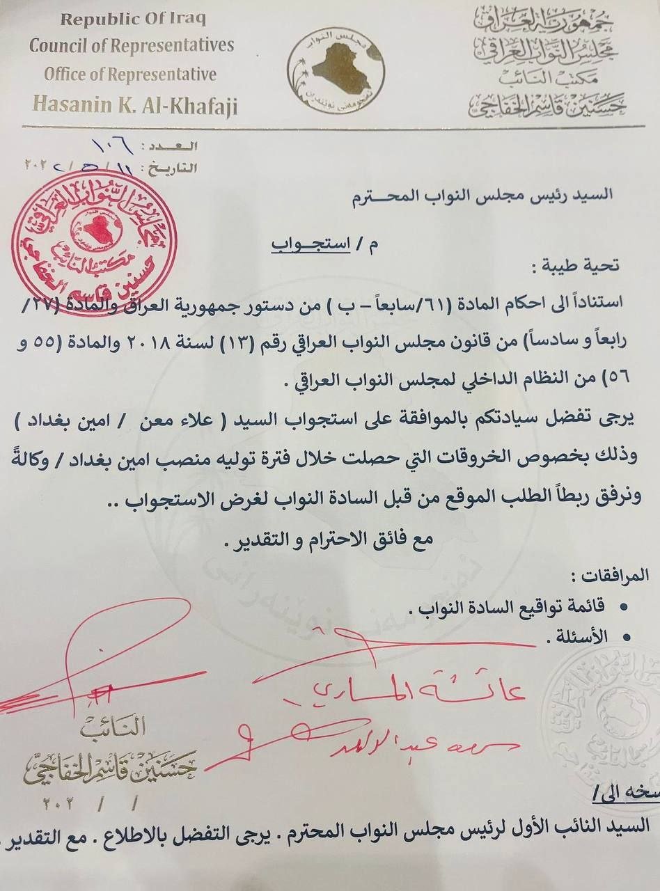 وثيقة تحمل عدد من التواقيع النيابي لغرض استجواب أمين بغداد علاء معن تمهيداً لإقالته.