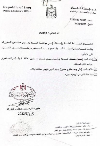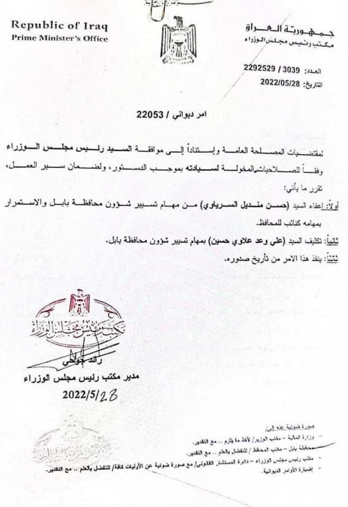 كلف رئيس الوزراء مصطفى الكاظمي، اليوم السبت، علي وعد علاوي بمهام "تسيير شؤون" محافظة بابل، خلفا للمحافظ السابق حسن منديل.