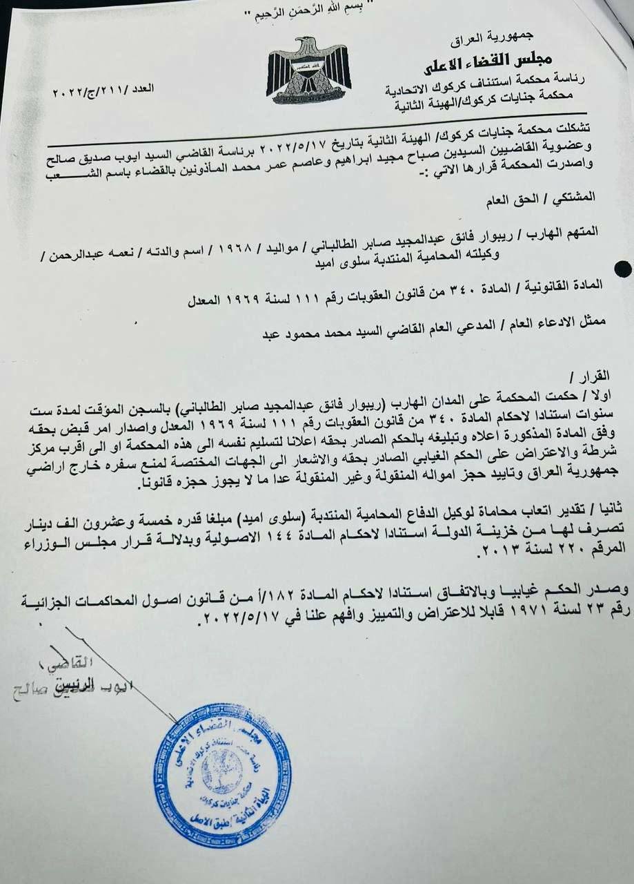 قضت محكمة جنايات كركوك، السجن المؤقت ست سنوات بحق "المتهم الهارب" ريبوار طالباني، وفق المادة 340 من قانون العقوبات العراقي النافذ.