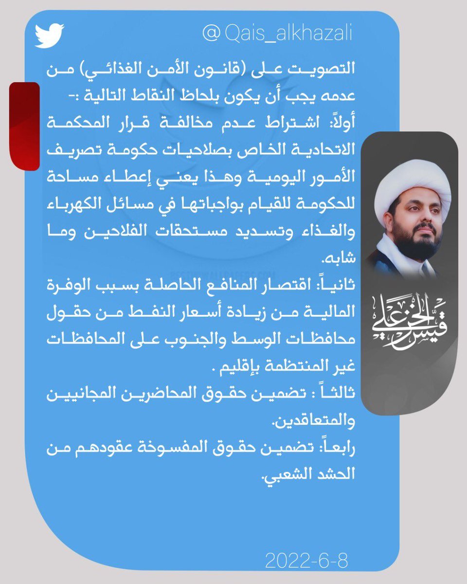 وقال الخزعلي في تغريدة على منصة تويتر تابعتها " تنوع نيوز”، إن التصويت على قانون الأمن الغذائي من عدمه يجب أن يكون بلحاظ النقاط التالية: