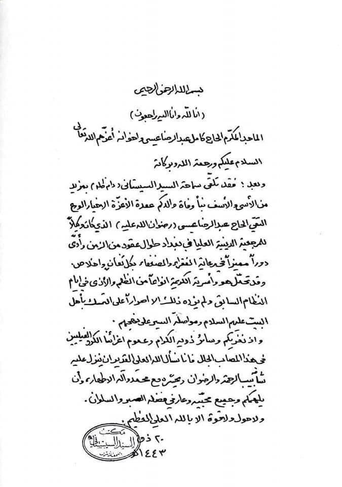 نعى المرجع الشيعي الأعلى السيد علي السيستاني، يوم الإثنين، وكيله عبد الرضا عيسى الفيلي الذي وافته المنية في العاصمة بغداد.