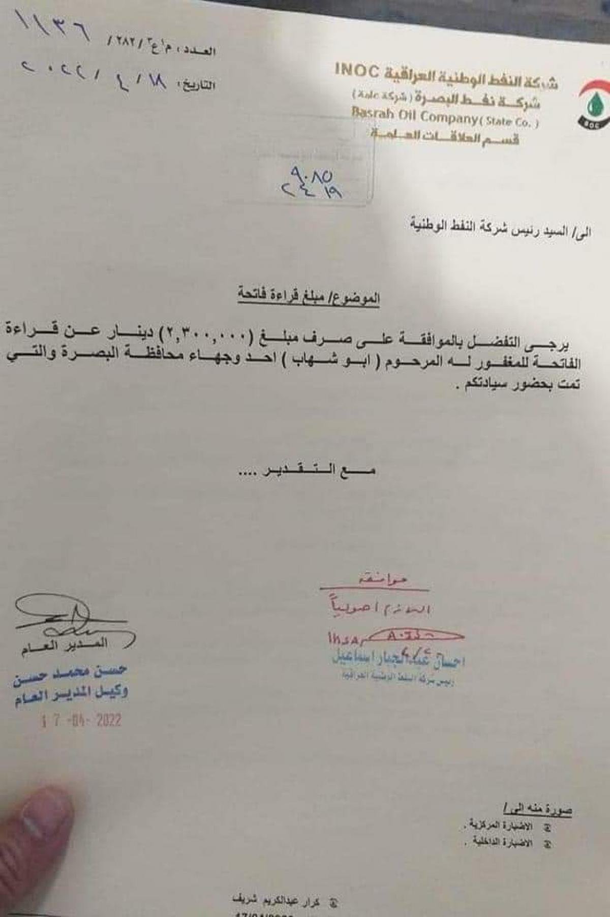كشفت وثيقة صادرة من شركة النفط الوطنية، تتضمن طلباً بصرف 1.3 مليون دينار مقابل "قراءة الفاتحة" على روح أحد وجهاء محافظة البصرة.