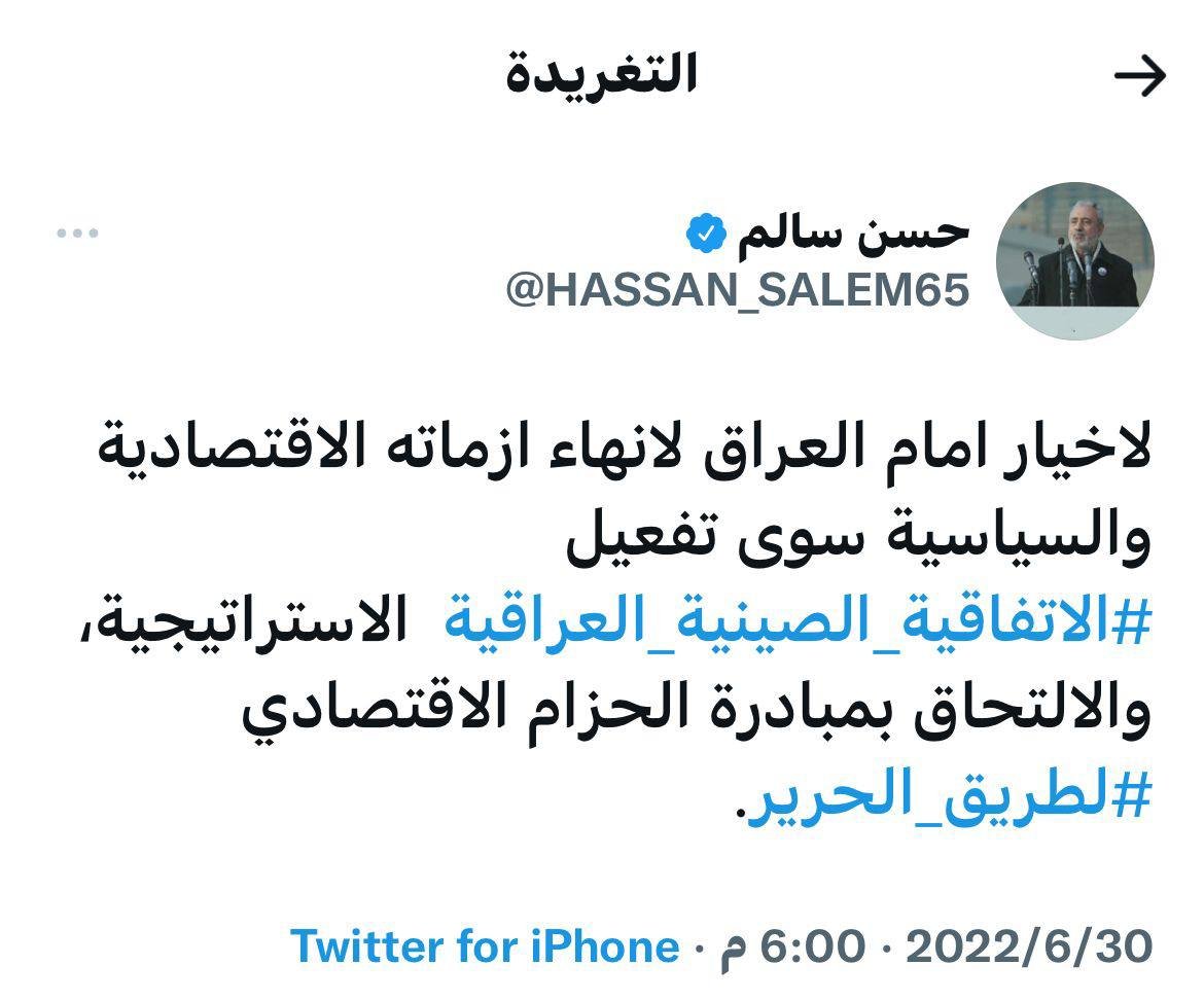 اعتبر عضو كتلة الصادقون النيابية، حسن سالم، أن لا خيار امام العراق لإنهاء ازماته الاقتصادية والسياسية سوى تفعيل الاتفاقية الصينية.