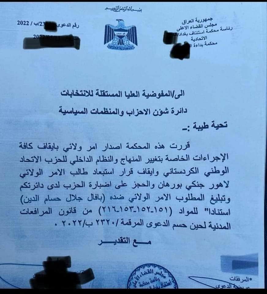 اصدر القضاء، حكماً بإيقاف التعامل مع بافل طالباني كرئيس للاتحاد الوطني الكردستاني بعد دعوى قضائية رفعها ضده لاهور شيخ جنكي.