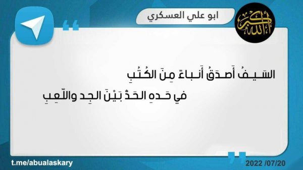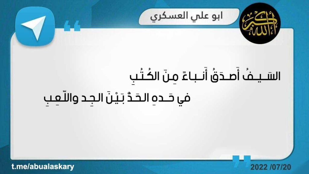 وقال العسكري في تغريدة عبر تويتر تابعتها “تنوع نيوز”، “السَيفُ أَصدَقُ أَنباءً مِنَ الكُتُبِ، في حَدِّهِ الحَدُّ بَينَ الجِدِّ وَاللَعِبِ”.