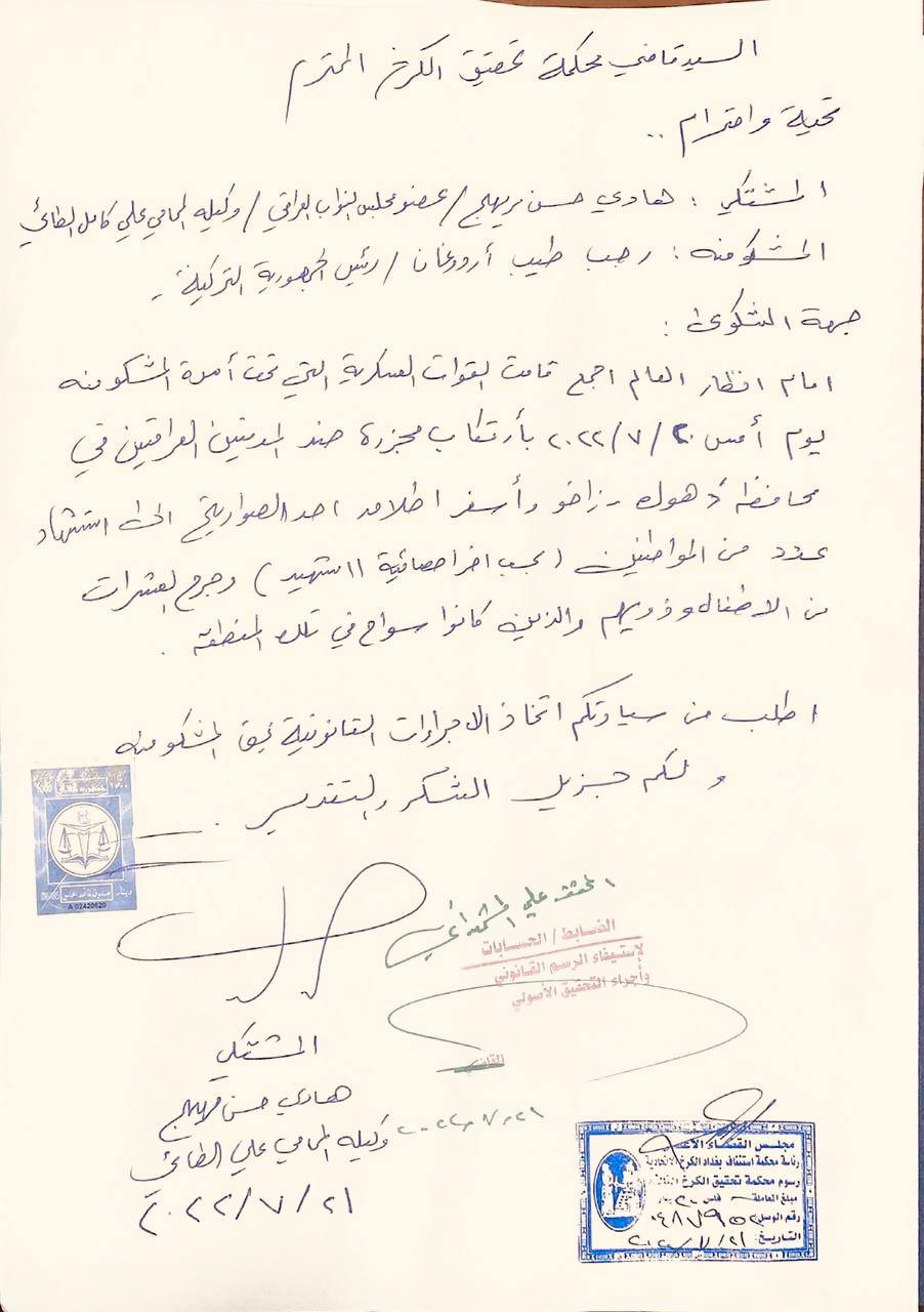 وبحسب وثيقة حصلت عليها وكالة "تنوع نيوز" اليوم الخميس فإن المحامي علي الطائي وكيلا عن النائب المستقل هادي السلامي قدم الشكوى لدى محكمة استئناف الكرخ ضد اردوغان.