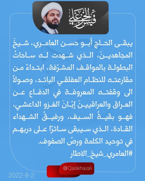 وقال سماحته بتغريدة على منصة تويتر تابعتها وكالة "تنوع نيوز”، يبقى الحاج ابو حسن العامري، شيخ المجاهدين ، الذي شهدت له ساحات البطولة بالمواقف المشرفة، ابتداءً من مقارعته للنظام العفلقي البائد، وصولا الى وقفته المعروفة بالدفاع عن العراق والعراقيين إبان الغزو الداعشي.