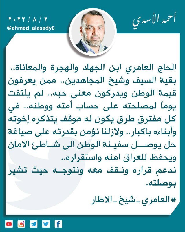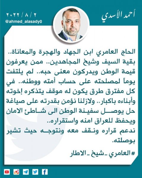 وقال الأسدي في تغريدة عبر تويتر تابعتها "تنوع نيوز" ، اليوم الثلاثاء، إن "الحاج العامري ابن الجهاد والهجرة والمعاناة، بقية السيف وشيخ المجاهدين، ممن يعرفون قيمة الوطن ويدركون معنى حبه، لم يلتفت يوماً لمصلحته على حساب أمته ووطنه في كل مفترق طرق يكون له موقف يتذكره إخوته وأبناءه باكبار".