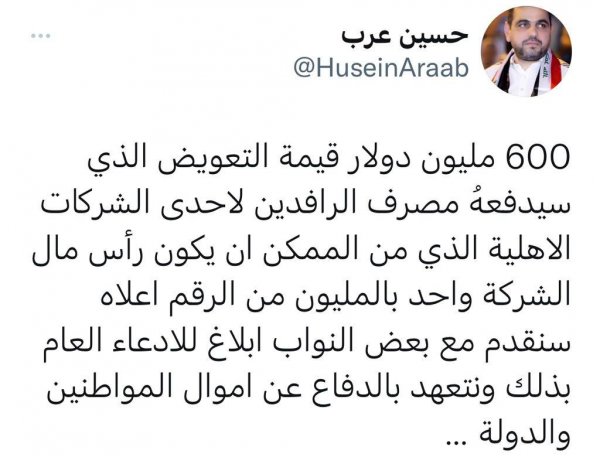 برلمانيون يقدمون إبلاغاً للادعاء العام لمعرفة "خفايا" دفع مصرف الرافدين 600 مليون دولار لصالح شركة أهلية.