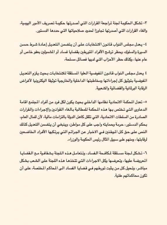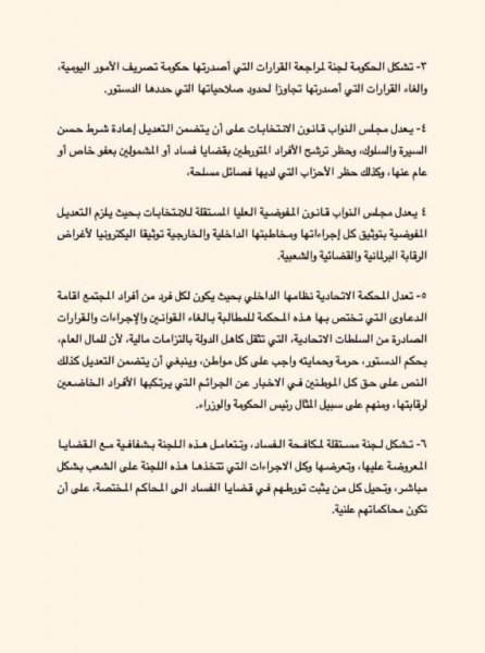 وتتكون مبادرة المستقلين من ست فقرات بينها تشكيل لجنة لمكافحة الفساد وأخرى لمراجعة القرارات التي اصدرتها حكومة تصريف الأعمال.