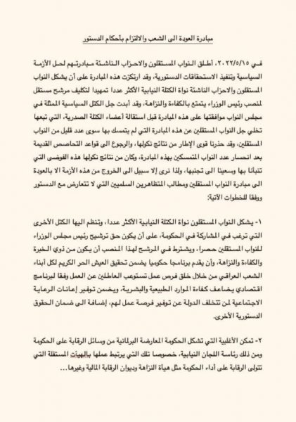قدم النواب المستقلون في العراق، اليوم السبت، مبادرة جديدة تؤكد على تشكيلهم مع الأحزاب الناشئة الكتلة النيابية الأكثر عددا تمهيدا لتكليف مرشح مستقل لمنصب رئيس الوزراء.