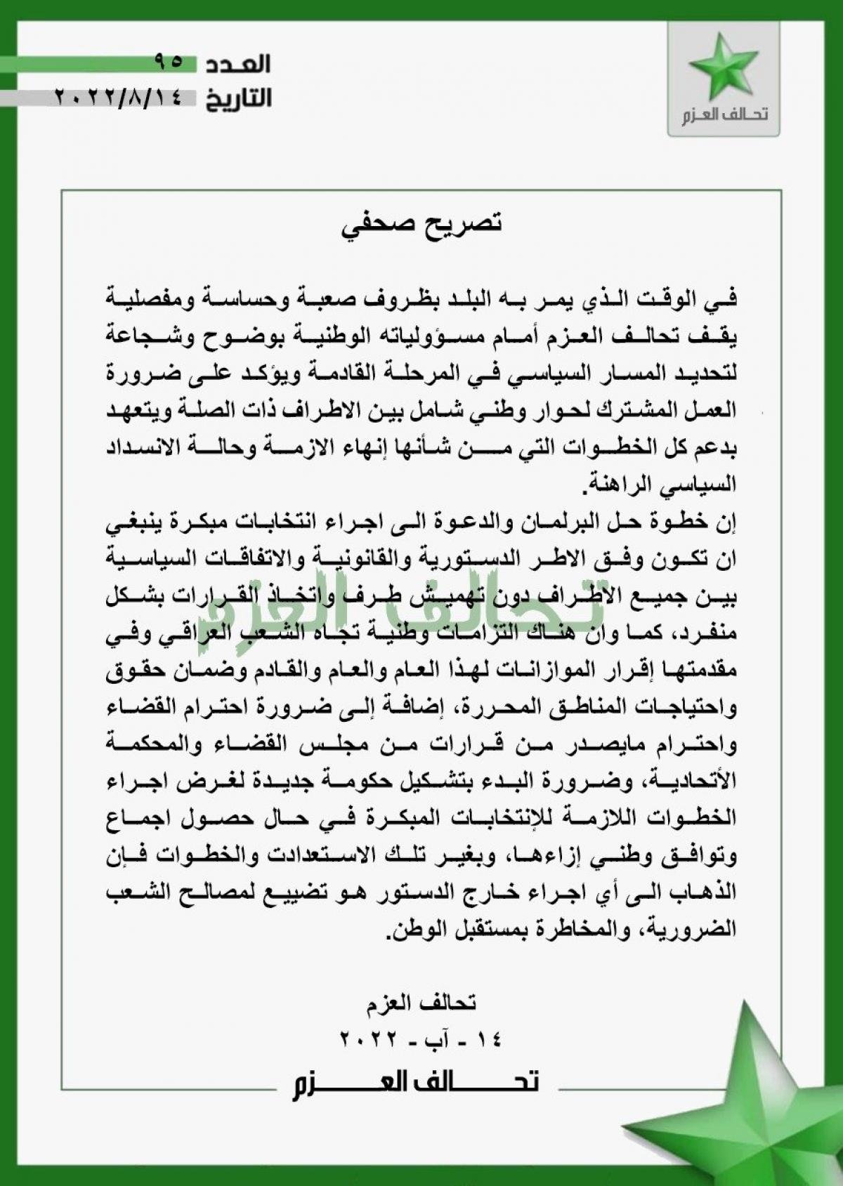 تحالف العزم يشدد على ضرورة البدء بتشكيل الحكومة لاجراء الخطوات اللازمة للانتخابات المبكرة.