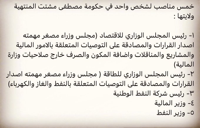 قال النائب مصطفى سند، اليوم الخميس، أن شخص واحد في حكومة مصطفى الكاظمي يدير خمسة مناصب.وكتب سند في تدوينة على منصة “تويتر” طالعتها “تنوع نيوز”، ما ورد في أدناه.