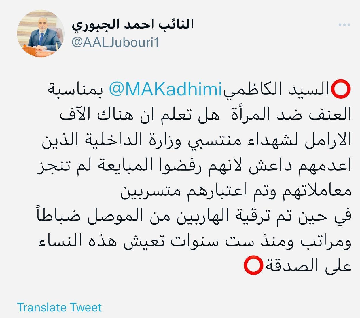 وقال الجبوري في تغريدة على تويتر تابعتها "تنوع نيوز" اليوم السبت، "بمناسبة العنف ضد المرأة هل تعلم ان هناك الآف الارامل لشهداء منتسبي وزارة الداخلية الذين اعدمهم داعش لانهم رفضوا المبايعة لم تنجز معاملاتهم وتم اعتبارهم متسربين".
