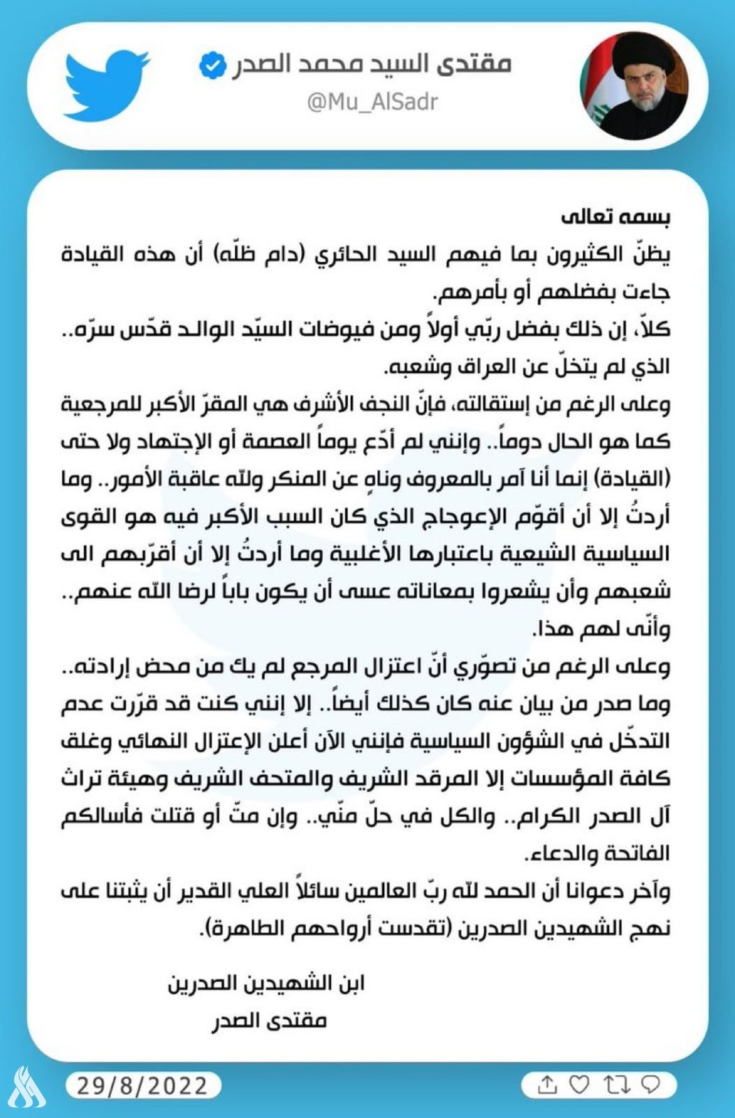 أعلن زعيم التيار الصدري مقتدى الصدر، اليوم الاثنين، "الاعتزال النهائي" للعمل السياسي.