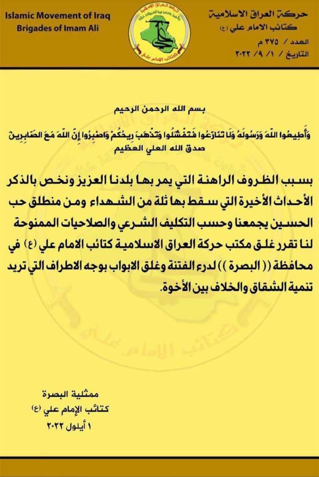 وقالت الحركة في بيان اليوم، إنه "تقرر غلق مكتب حركة العراق الاسلامية كتائب الامام علي في محافظة البصرة لدرء الفتنة وغلق الأبواب بوجه الأطراف التي تريد تنمية الشقاق والخلاف بين الأخوة".