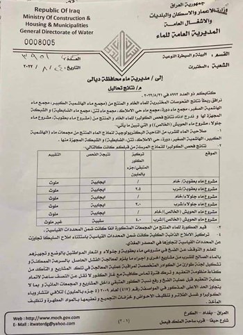 وثيقة رسمية صادرة عن مديرية الماء العامة تقر بموجبها وجود مياه ملوثة في بعض محطات الاسالة الرئيسية بديالى خاصة بعقوبة وجلولاء مع التحذير باحتمالية ان يؤدي التلوث الى بروز مرض الكلوليرا.