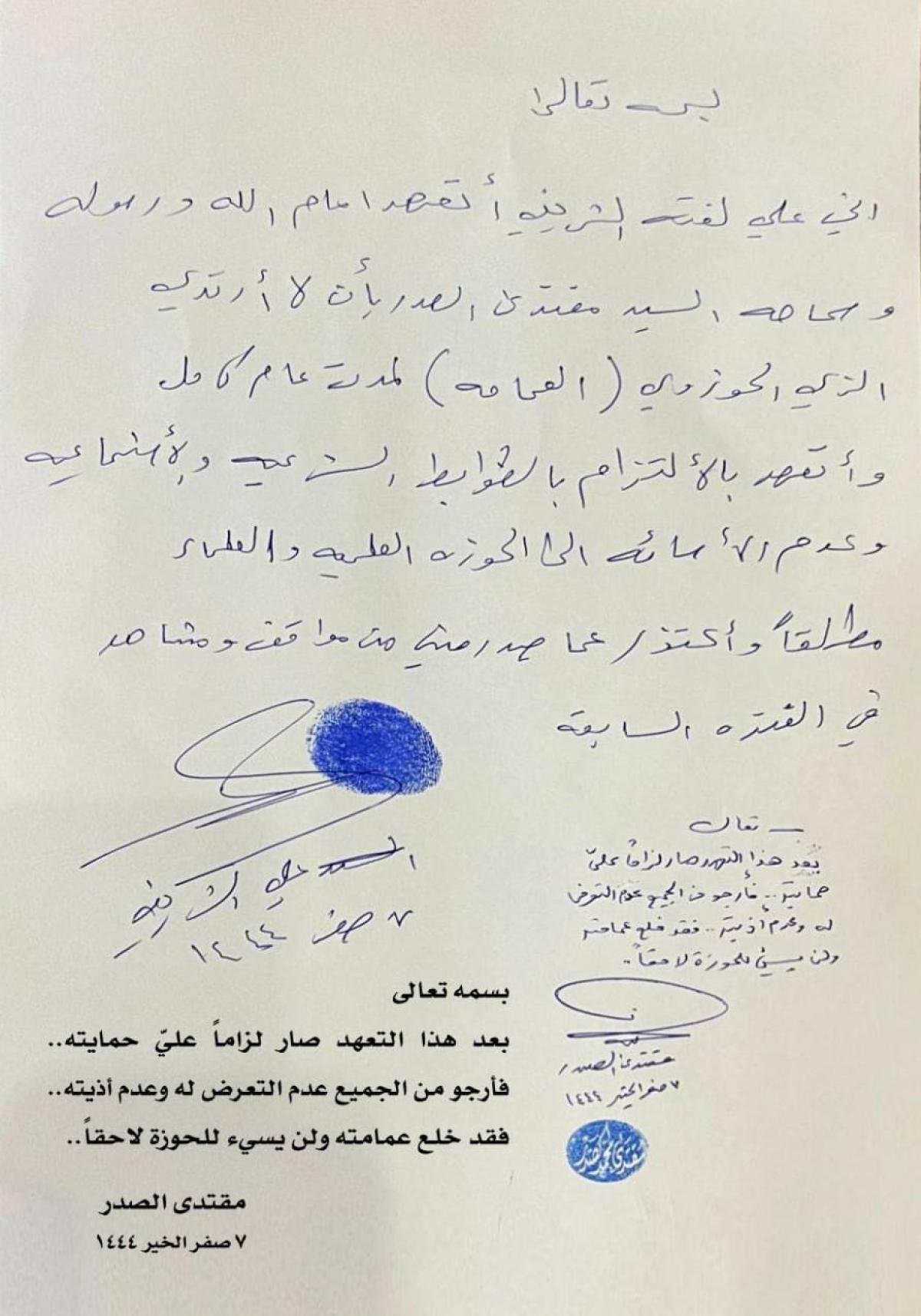 نشر المكتب الخاص لزعيم التيار الصدري السيد مقتدى الصدر، صورة تجمع الأخير مع رجل الدين المثير للجدل علي الشريفي، أرفق بجوارها تعهداً خطياً له بعدم ارتداء الزي الحوزوي لمدة عام كامل.