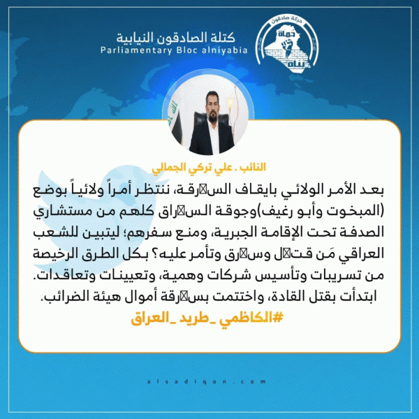 وقال الجمالي في تغريدة على منصة تويتر، واطلعت عليها وكالة “ تنوع  نيوز” ما نصه: “بعد الأمر الولائي بايقاف السرقة، ننتظر أمراً ولائياً بوضع (المبخوت وأبو رغيف)وكل جوقة السراق من مستشاري الصدفة تحت الإقامة الجبرية، ومنع سفرهم؛ ليتبين للشعب العراقي مَن قتل وسرق وتأمر عليه؟ بكل الطرق الرخيصة من تسريبات وتأسيس شركات وهمية، وتعيينات وتعاقدات. ابتدأت بقتل القادة، واختتمت بسرقة أموال هيئة الضرائب.