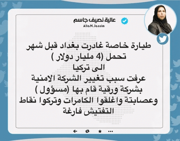 كشفت عضو مجلس النواب عالية نصيف اليوم الاربعاء، عن مغادرة طائرة محملة بالاموال من العراق نحو تركيا ذلك بعد اغلاق الكاميرات واخلاء نقاط التفتيش.