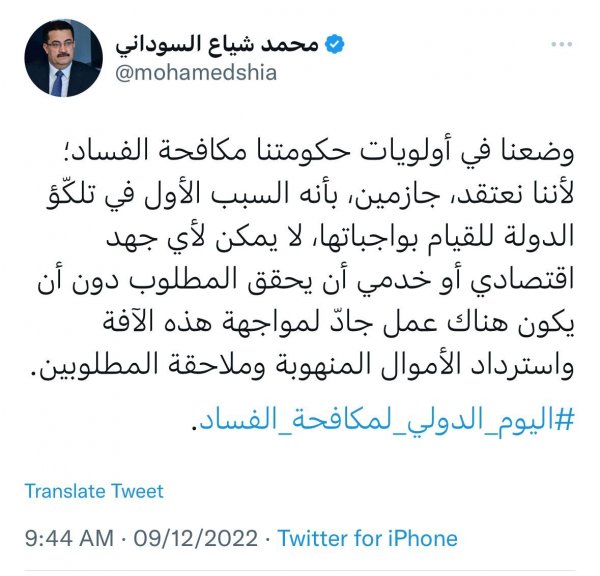 وقال السوداني في تغريدة له تابعتها وكالة "تنوع نيوز" : "وضعنا في أولويات حكومتنا مكافحة الفساد؛ لأننا نعتقد، جازمين، بأنه السبب الأول في تلكّؤ الدولة للقيام بواجباتها، لا يمكن لأي جهد اقتصادي أو خدمي أن يحقق المطلوب دون أن يكون هناك عمل جادّ لمواجهة هذه الآفة واسترداد الأموال المنهوبة وملاحقة المطلوبين".