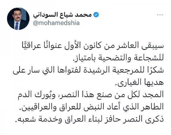 وقال السوداني في تغريدة له تابعتها وكالة "تنوع نيوز" : "سيبقى العاشر من كانون الأول عنواناً عراقيّاً للشجاعة والتضحية بامتياز، وشكراً للمرجعية الرشيدة لفتواها التي سار على هديها الغيارى".