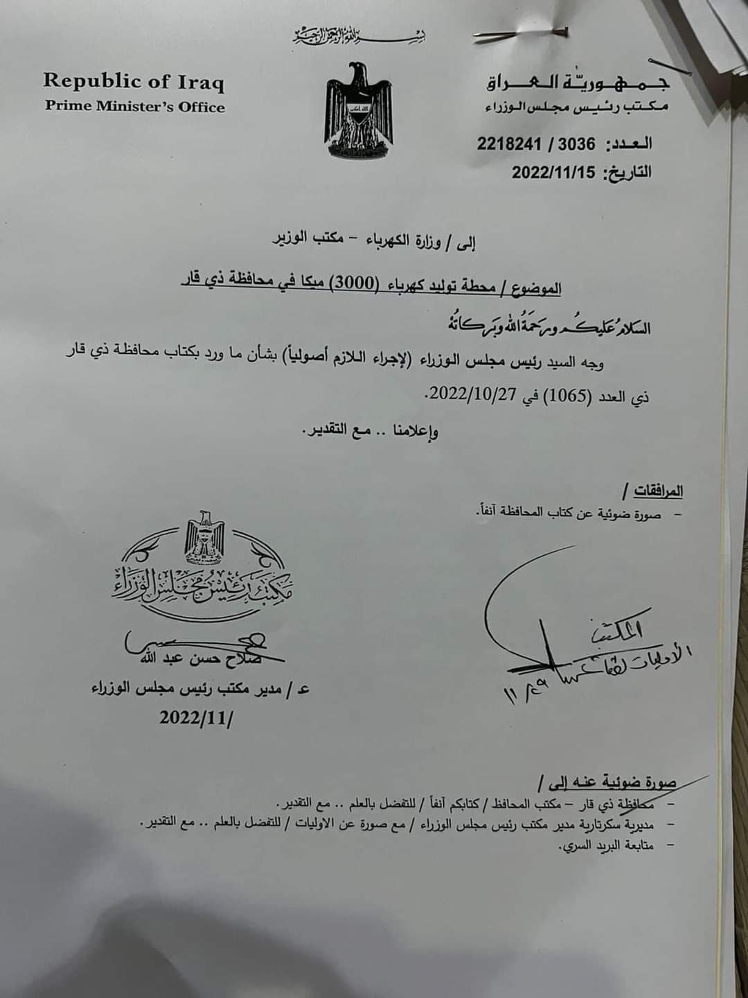 السوداني يوافق على إنشاء محطة لإنتاج الكهرباء في ذي قار (وثيقة)