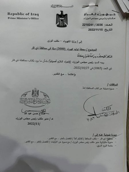 أعلن محافظ ذي قار، محمد الغزي، يوم الأحد، موافقة رئيس الوزراء العراقي، محمد شياع السوداني، على انشاء محطة إنتاج للكهرباء، بطاقة 3000 ميغاواط، في المحافظة.