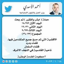 وقال الاسدي في تغريدة تابعتها وكالة "تنوع نيوز" إن “حملة (ابشر يالفقير) بحثت في اليوم الأول نحو 14.347، وفي اليوم الثاني 12.131، وفي اليوم الثالث 9.699 اسرة”.