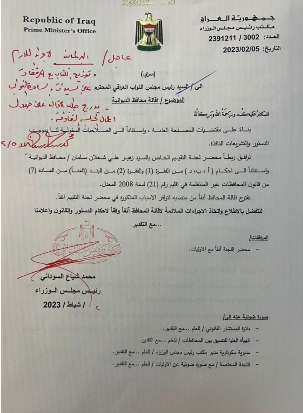 أقترح رئيس الوزراء محمد شياع السوداني، على البرلمان إقالة محافظ الديوانية زهير الشعلان.