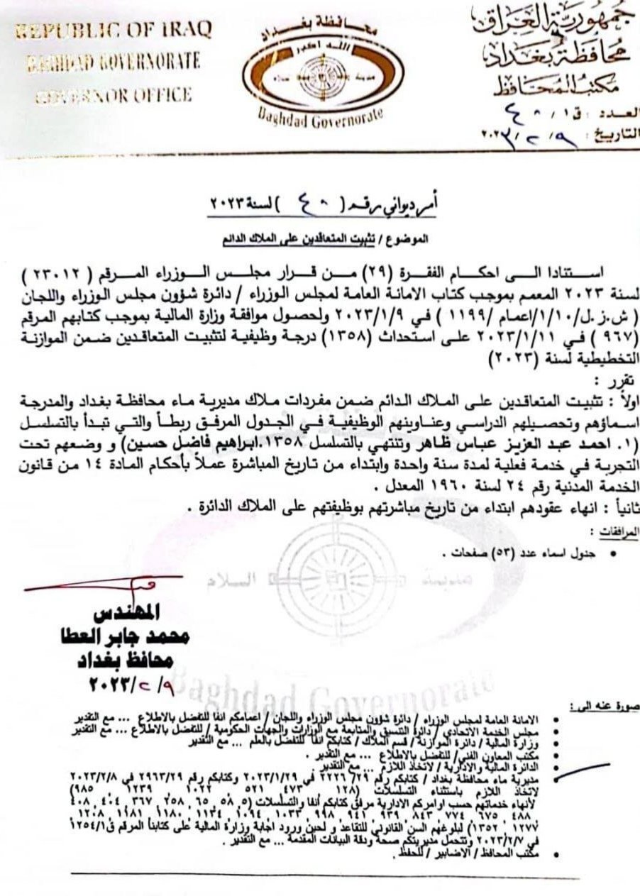 أصدر محافظ بغداد محمد جابر العطا، اليوم الخميس، أمرين ديوانيين بتثبيت العقود في مديريتي ماء ومجاري محافظة بغداد على الملاك الدائم.
