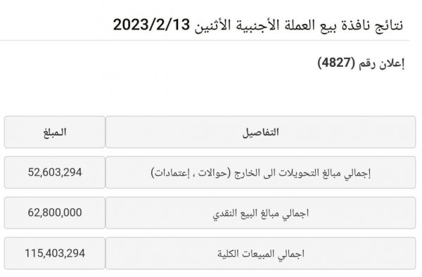 انخفضت مبيعات البنك المركزي العراقي، الإثنين، الى 115 مليون دولار بتعاملات اليوم.وجاءت نتائج نافذة بيع العملة الأجنبية لهذا اليوم كما مبين في أدناه