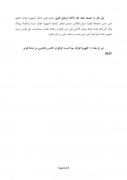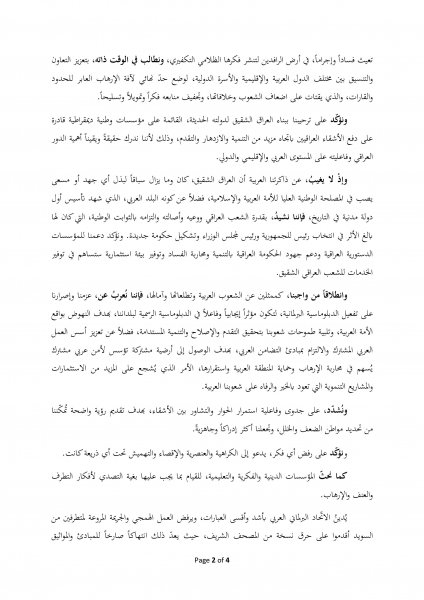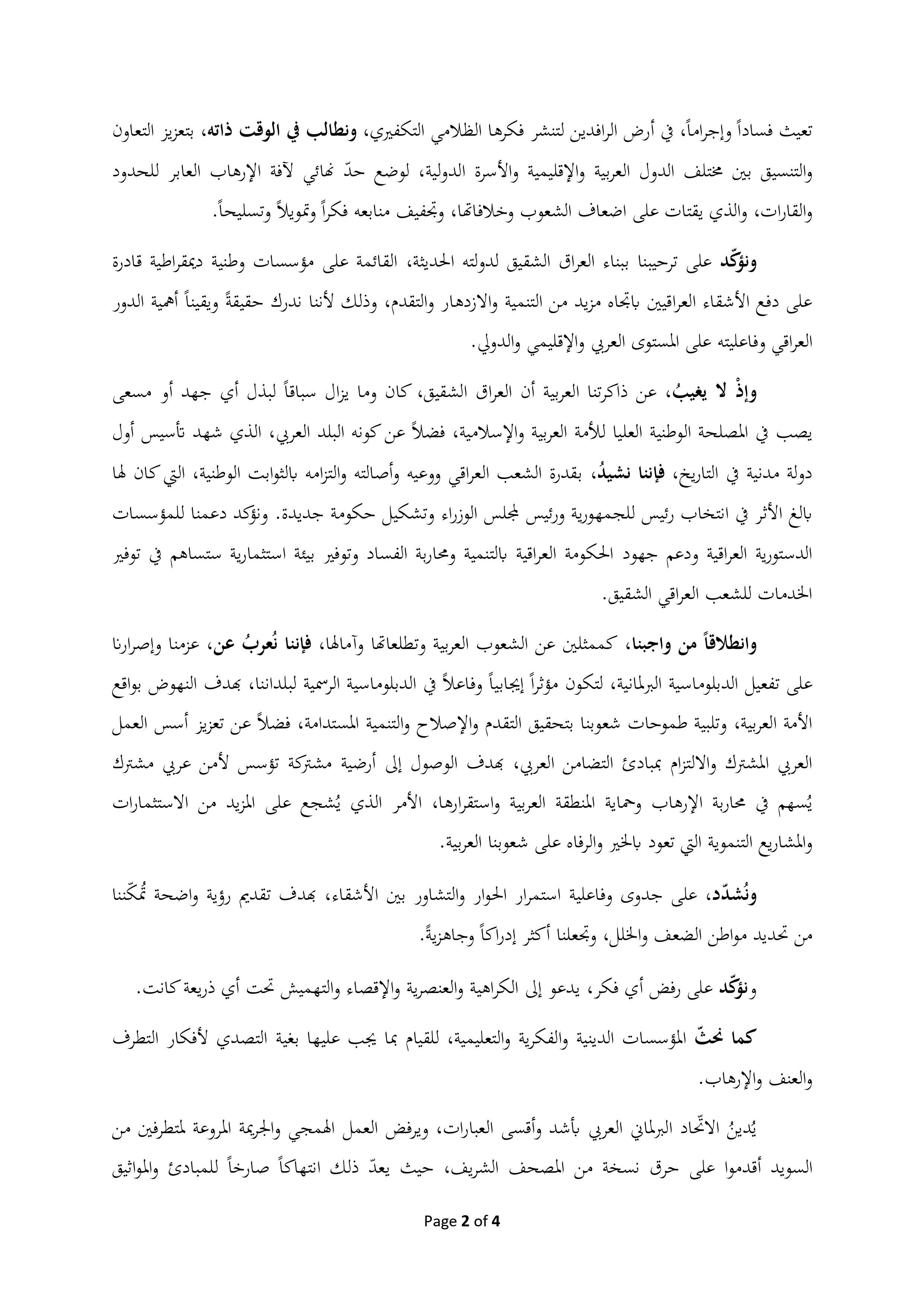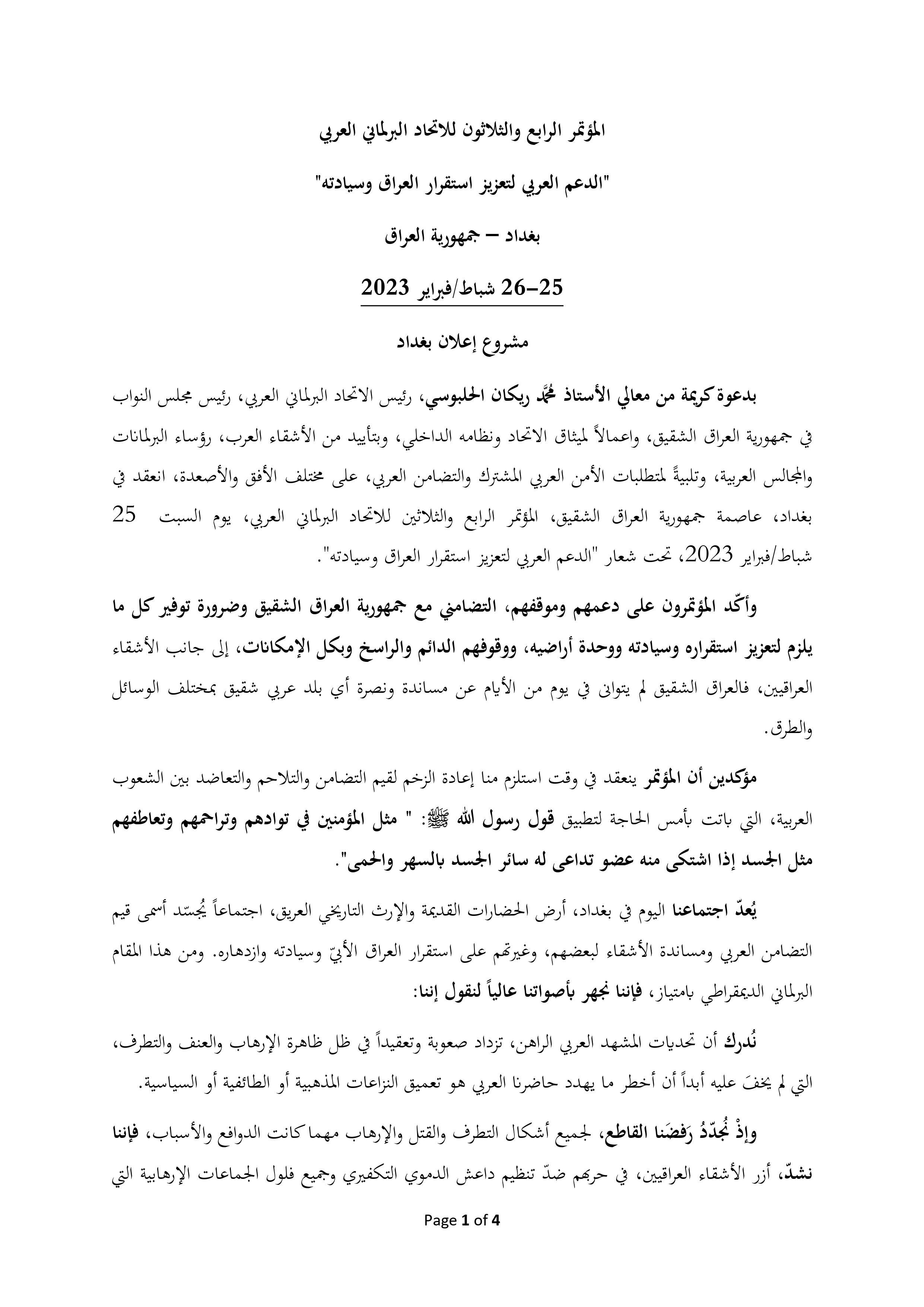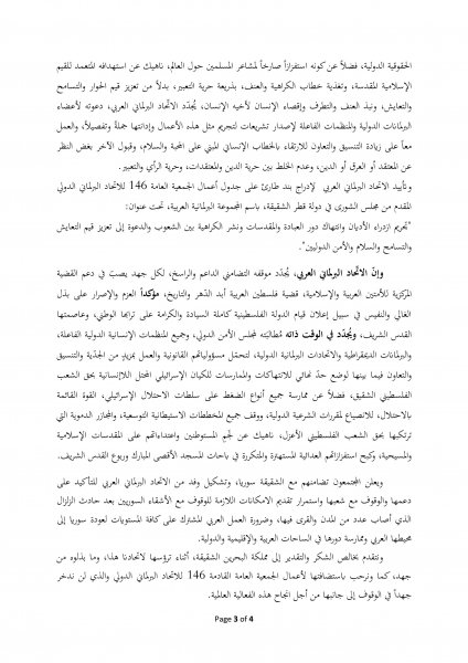 تنشر وكالة "تنوع نيوز" اليوم السبت، البيان الختامي لمؤتمر الاتحاد البرلماني العربي