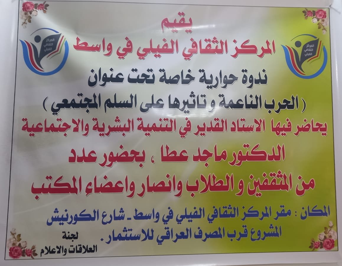 بأشراف ومتابعة من الحقوقي ( علي الاسد ) مدير المركز الثقافي الفيلي في واسط - اقام المركز الثقافي الفيلي في واسط ، محاضر ة وندوة خاصة تحت عنوان ( الحرب الناعمة و تاثيرها على السلم المجتمعي) بحضور الاستاد القدير في التنمية البشرية والاجتماعية . (الدكتور ماجد عطا) ، وبحضور عدد مميز من المثقفين و الطلاب وانصار واعضاء مكتب الثقافي الفيلي في واسط .![]()