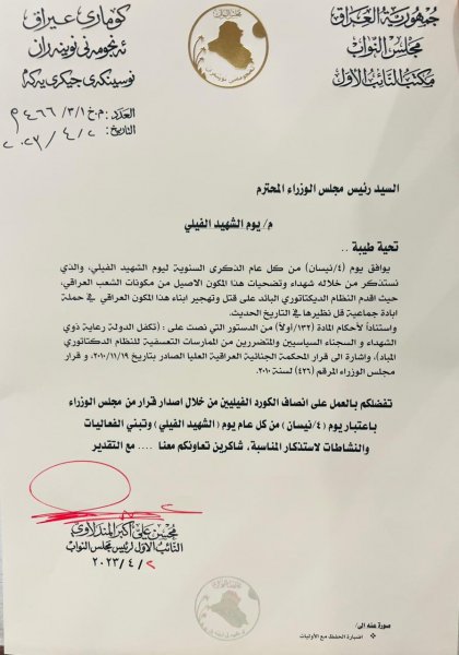ودعا سيادته الى انصاف المكون الكوردي الفيلي من خلال تبني مجلس الوزراء ان يكون يوم (4 نيسان )من كل عام يوم لشهيد الكوردي الفيلي واقامة الفعاليات والنشاطات التي من شأنها بيان تضحيات الشهداء وذويهم وماقدموه للدفاع عن العراق والعراقيين وعرفانا لدمائهم الزكيه.![]()