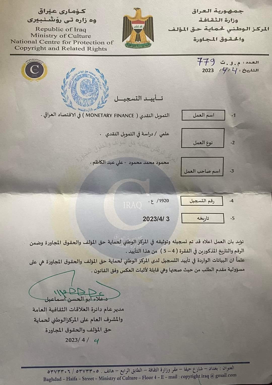 حصل الدكتورعلي دعدوش عضو في الهيئة الاستشارية في المؤتمر الوطنس العام للكورد الفيليين على وبمعية البروفيسور الدكتور Mahmood Daghir على حقوق ملكية فكرية في توظيف مصطلح #التمويل_النقدي Monetary Finance في الاقتصاد العراقي .