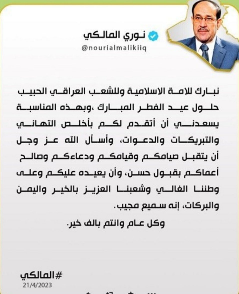 هنأ رئيس ائتلاف دولة القانون، نوري المالكي، اليوم الجمعة، العراقيين بمناسبة عيد الفطر المبارك.وادناه نص التهنئة :