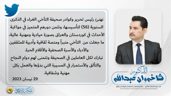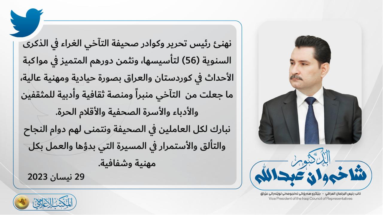 وجه نائب رئيس مجلس النواب العراقي د.شاخوان عبدالله أحمد اليوم السبت 2023/4/29 برقية تهنئـة إلى رئيس تحرير وكوادر صحيفة التآخي الغراء في الذكرى السنوية الـسادسة والخمسون لأنطلاقتها.