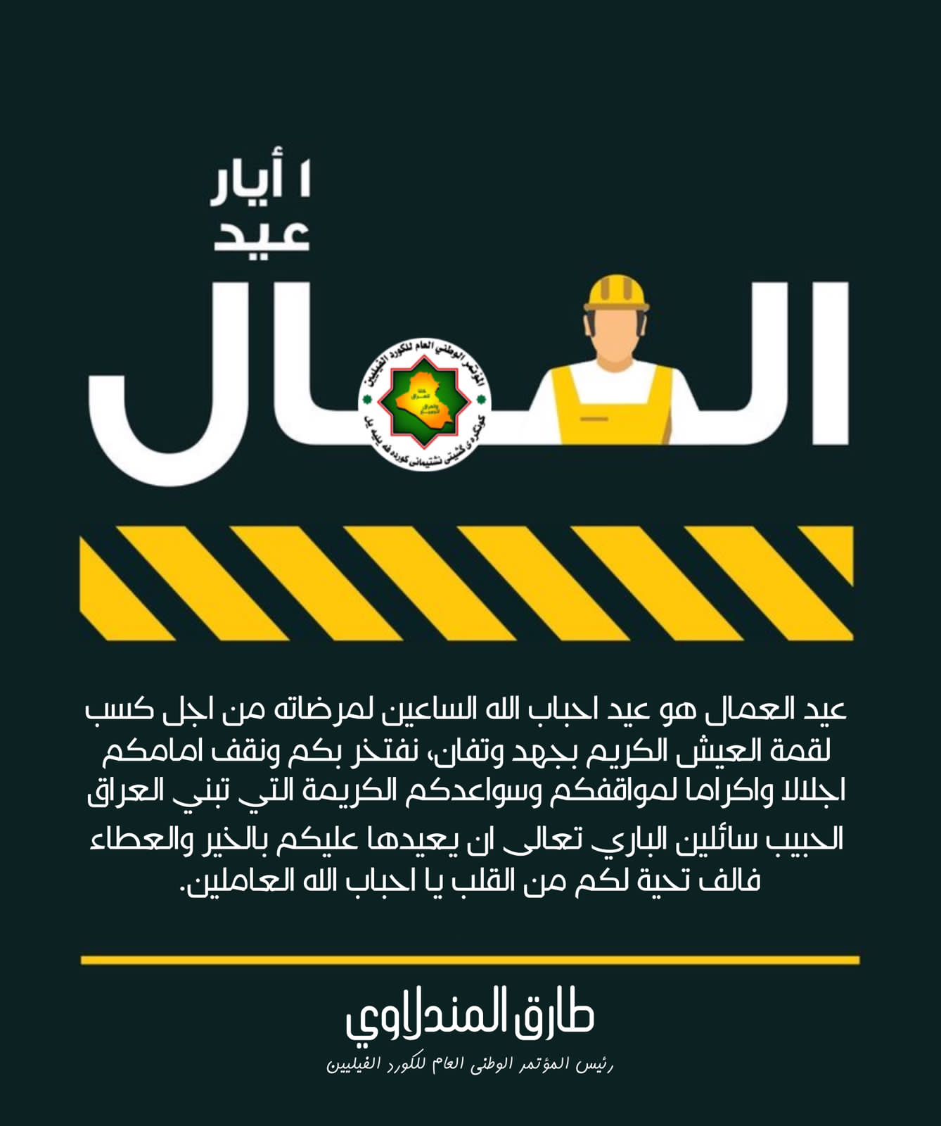 عيد العمال هو عيد احباب الله الساعين لمرضاته من اجل كسب لقمة العيش الكريم بجهد وتفان ، نفتخر بكم ونقف امامكم اجلالا واكراما لمواقفكم وسواعدكم الكريمة التي تبني العراق الحبيب سائلين الباري تعالى ان يعيدها عليكم بالخير والعطاء فالف تحية لكم من القلب يا احباب الله العاملين
