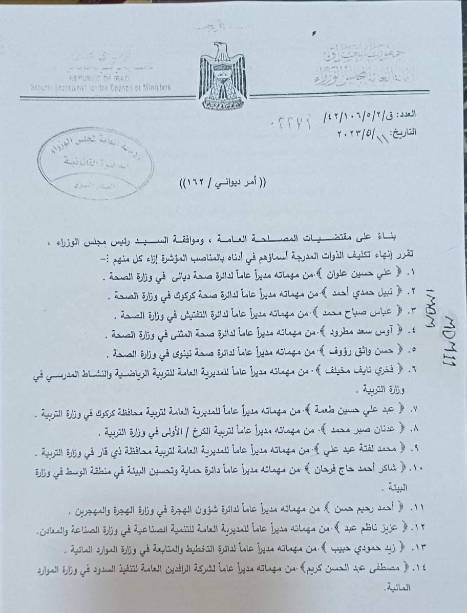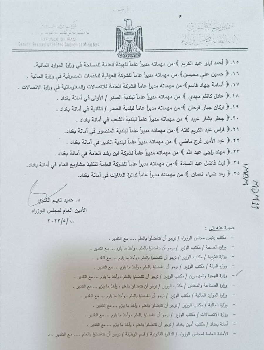 وحصلت وكالة "تنوع نيوز" على نسخة من كتاب موقع من الأمين العام لمجلس الوزراء حميد الغزي، يشير إلى" موافقة رئيس مجلس الوزراء محمد شياع السوداني على إنهاء تكليف 25 مديراً عاماً في دوائر الدولة".